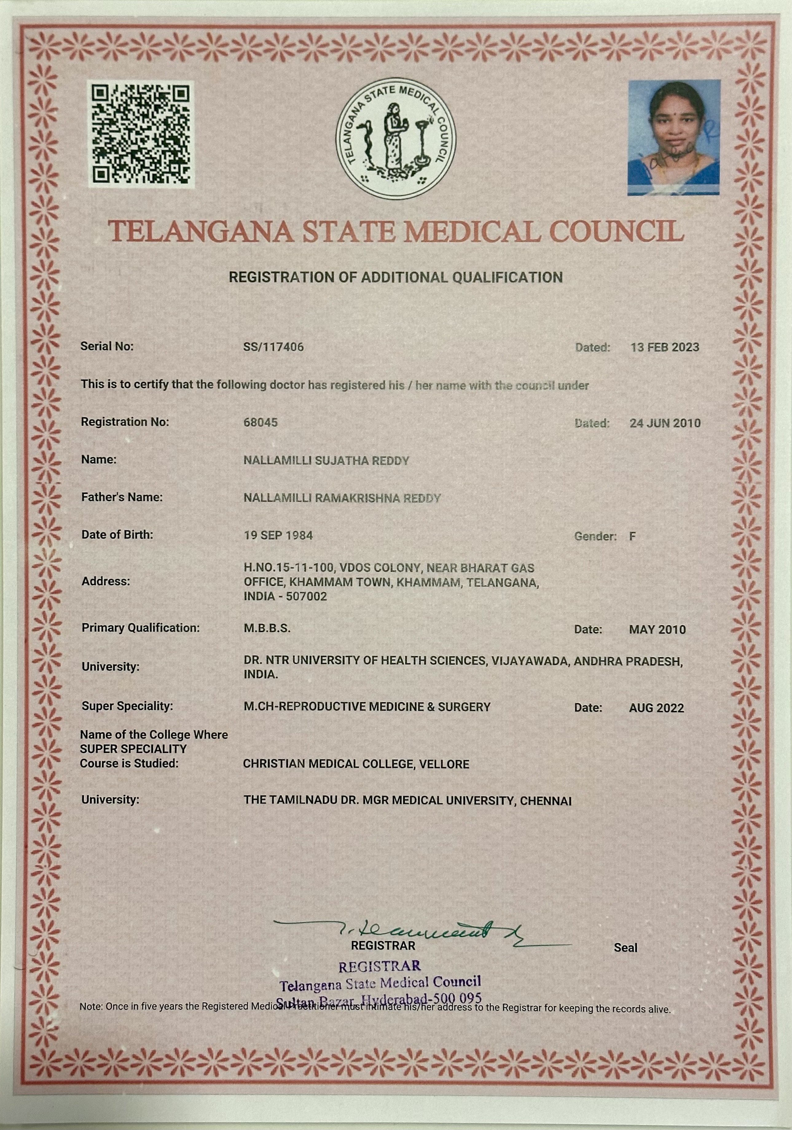 Dr. Sujatha Reddy is a highly qualified Fertility Super Specialist, renowned for her expertise in reproductive medicine and compassionate approach to patient care. As the Head of the Department at Sri Garbha Fertility Centre, she brings a wealth of experience in diagnosing and treating a wide range of fertility issues with evidence-based, personalized care.